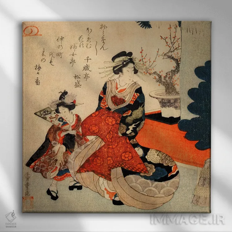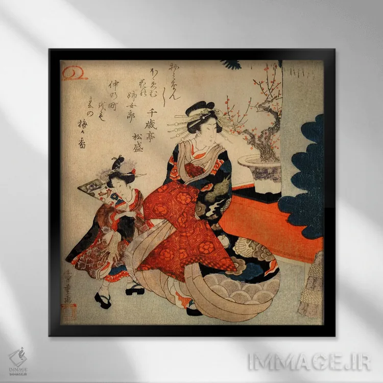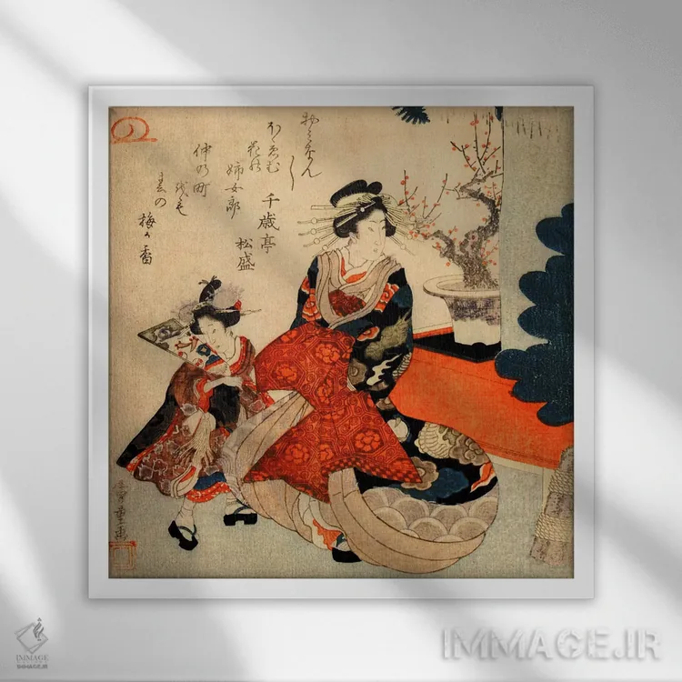 «کورتزان و کامورو در سال نو (ژاپن)» اثرِ «اوتاگاوا هیروشگه (نقاش و چاپگر ژاپنی اوکییو—ئه)» با حالوهوای دکور آسیایی و موضوعِ این اثر، برای فضاهای آرام، مینیمال و متعادل انتخاب مناسبی است.