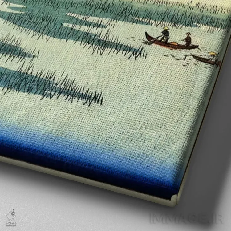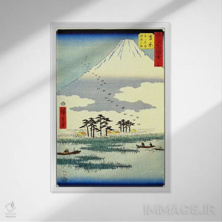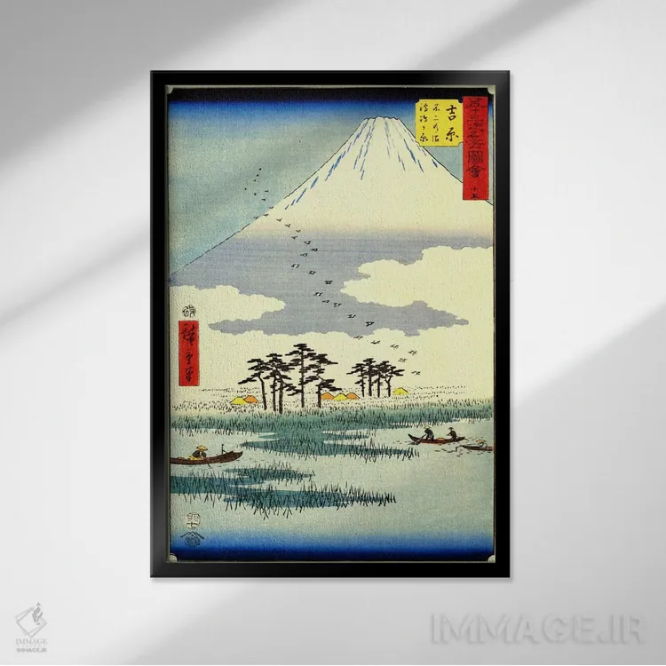 «یوشیوارا، جزایر شناور در باتلاق فوجی» اثرِ «اوتاگاوا هیروشگه (نقاش و چاپگر ژاپنی اوکییو—ئه)» با حالوهوای آسیایی، کنار نور ملایم و متریالهای طبیعی (چوب/سنگ) بسیار خوشفرم دیده میشود.