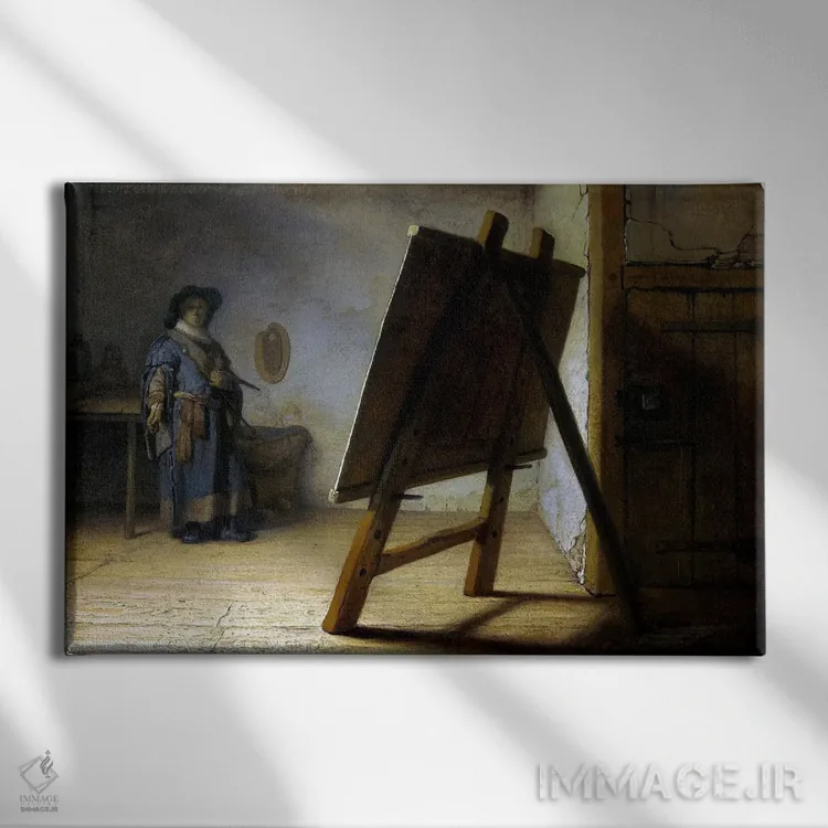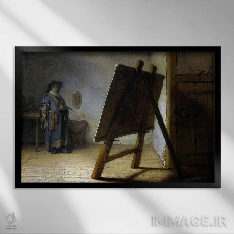 تابلو هنرمند در آتلیه اثر رمبرانت فان رَین (نقاش بزرگ هلندی) - نمای روبه‌رو روی دیوار
