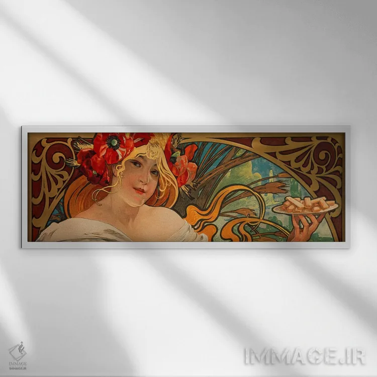 تابلو دکوراتیوِ این دسته با حسی هماهنگ؛ مناسب برای کافهاستایل خانگی و دیوار کنار میز ناهارخوری اثرِ «آلفونس موخا (هنرمند آرت نووی چک)».