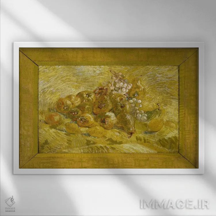 تابلو به، لیمو، گلابی و انگور اثر ونسان ون گوگ (نقاش مشهور هلندی پست‌امپرسیونیسم) - نمای قاب‌دار سفید