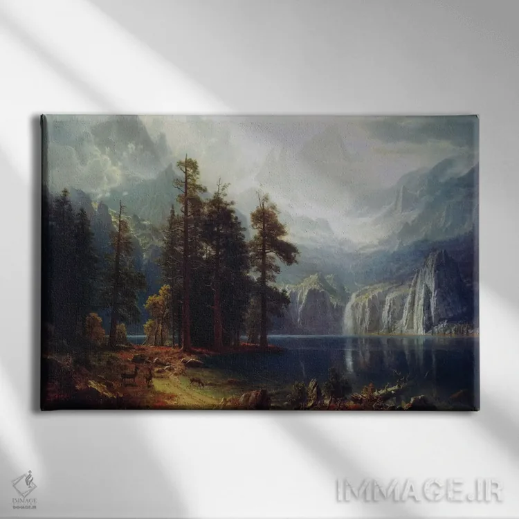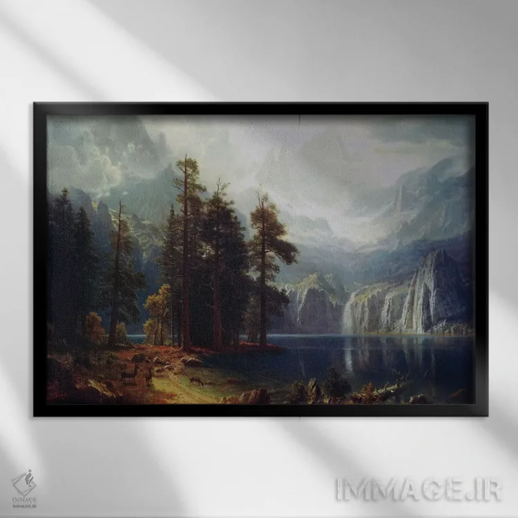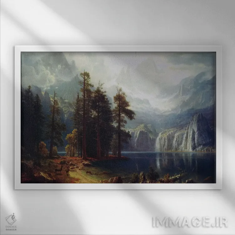 این اثرِ «آلبرت بیرشتات (نقاش منظره آمریکایی)» در لحن کلاسیک، وقار بصری دارد؛ موضوعِ این اثر هم برای دیوارِ شاخص و نورپردازی گرم بسیار مناسب است.