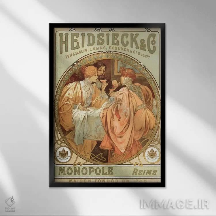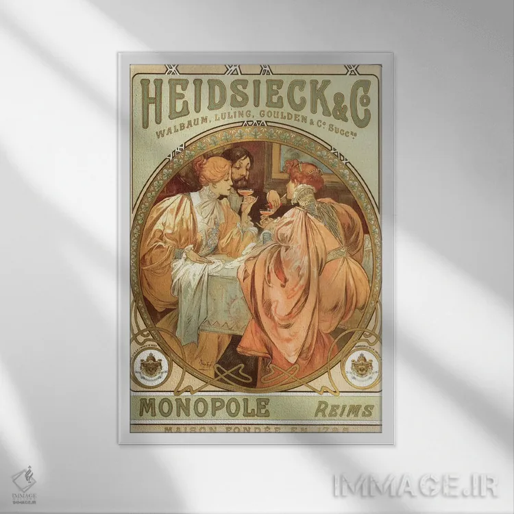 «نوشیدن شامپاین، ۱۷۸۵» اثرِ «آلفونس موخا (هنرمند آرت نووی چک)» برای کافهاستایلهای خانگی و دیوارهای نزدیک میز عالی است.
