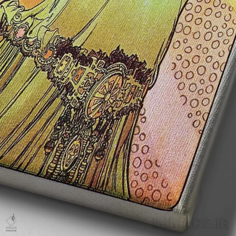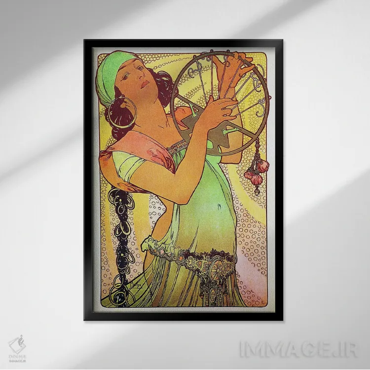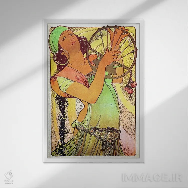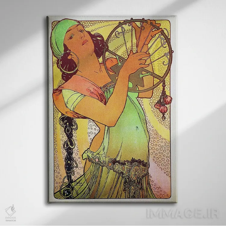 تابلو دکوراتیوِ «سالومهٔ مدرن با تمبر»؛ مناسب برای فضاهایی با چوب تیره، چراغهای گرم و اکسسوریهای کلاسیک اثرِ «آلفونس موخا (هنرمند آرت نووی چک)».