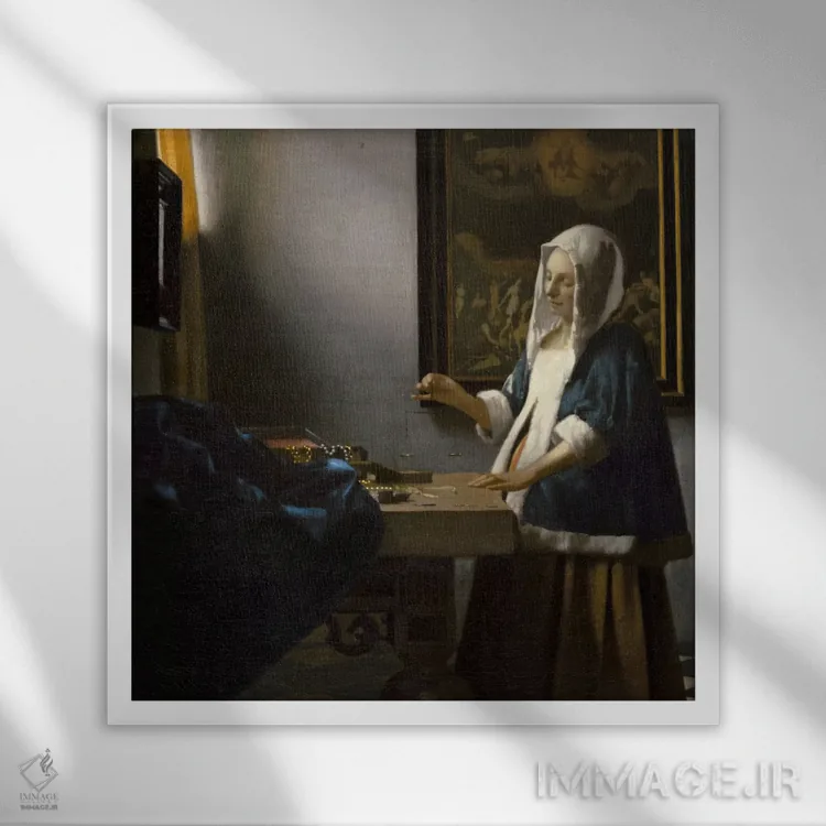 تابلو زن با ترازو اثر یوهانس ورمیر (نقاش هلندی) - نمای قاب‌دار سفید
