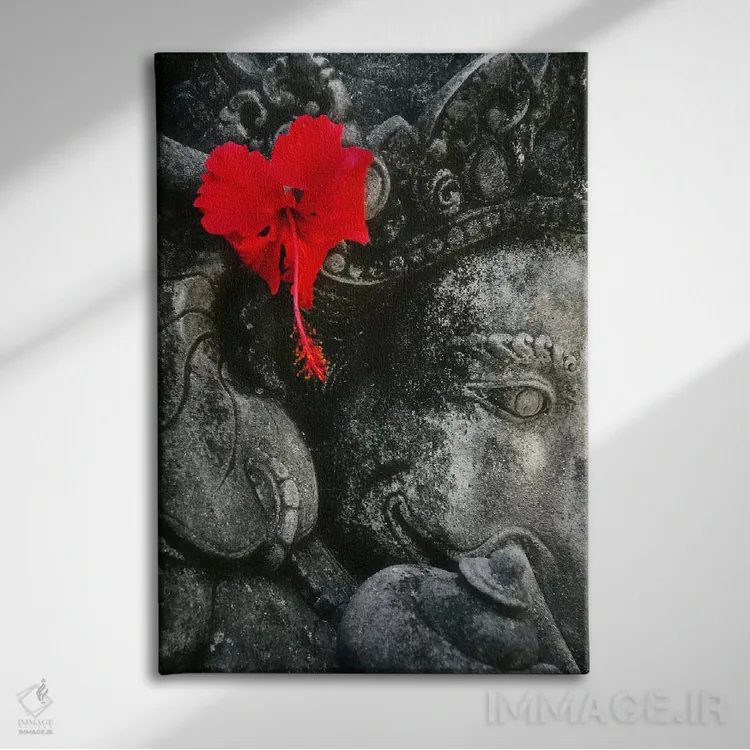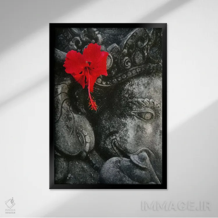 «تندیس گانش (خدای هندو)» اثرِ «هنرمند ناشناس» با حالوهوای آسیایی، کنار نور ملایم و متریالهای طبیعی (چوب/سنگ) بسیار خوشفرم دیده میشود.