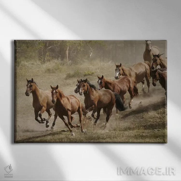 تابلو مزرعهٔ غربی و اسب‌های وحشی موستانگ اثر هنرمند ناشناس - نمای روبه‌رو روی دیوار