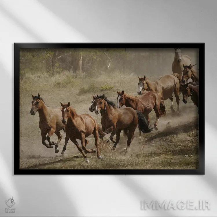 تابلو مزرعهٔ غربی و اسب‌های وحشی موستانگ اثر هنرمند ناشناس - نمای قاب‌دار مشکی