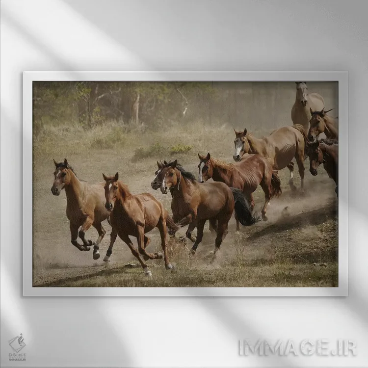 تابلو مزرعهٔ غربی و اسب‌های وحشی موستانگ اثر هنرمند ناشناس - نمای قاب‌دار سفید