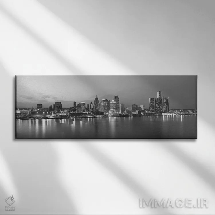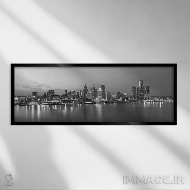 «منظرهٔ گستردهٔ آسماننمای دیترویت (سیاه و سفید)» اثرِ «هنرمند ناشناس» با بیان سیاهوسفید، کنار دیوارهای روشن و قابهای ساده بسیار خوشفرم دیده میشود؛ موضوعِ این اثر هم خوانا میماند.