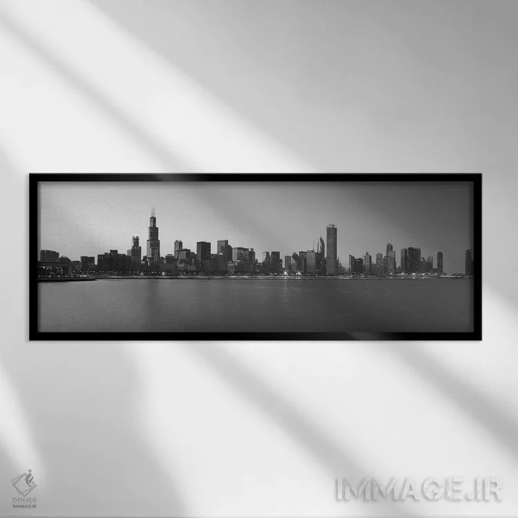 تابلو منظرهٔ گستردهٔ آسمان‌نمای شیکاگو (سیاه و سفید) اثر هنرمند ناشناس - نمای روبه‌رو روی دیوار