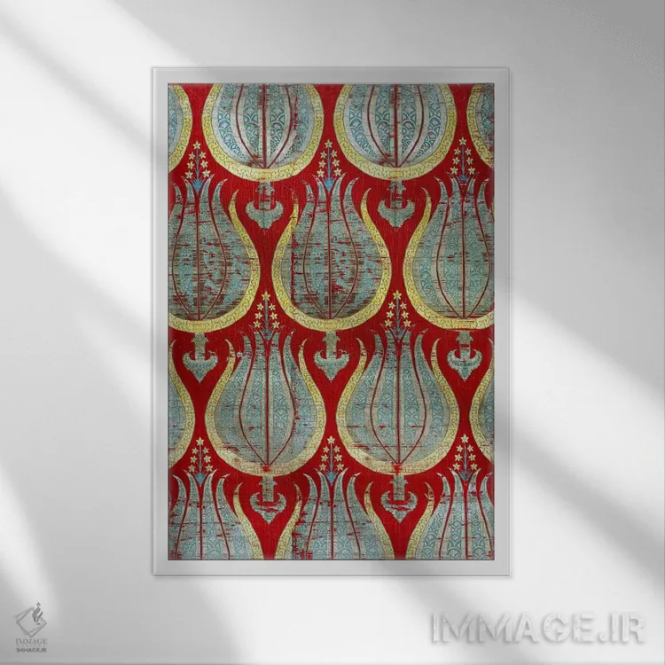 تابلو Silk & Silver Lamella Textile,لاله‌های عثمانی، منسوج ابریشمی و نقره‌ای اثر هنرمند ناشناس - نمای قاب‌دار سفید