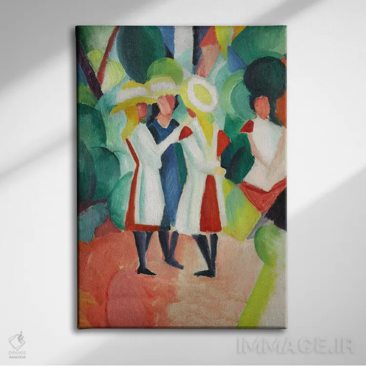 تابلو سه دختر با کلاههای حصیری زرد اثر آگوست ماکه (نقاش اکسپرسیونیست آلمانی)