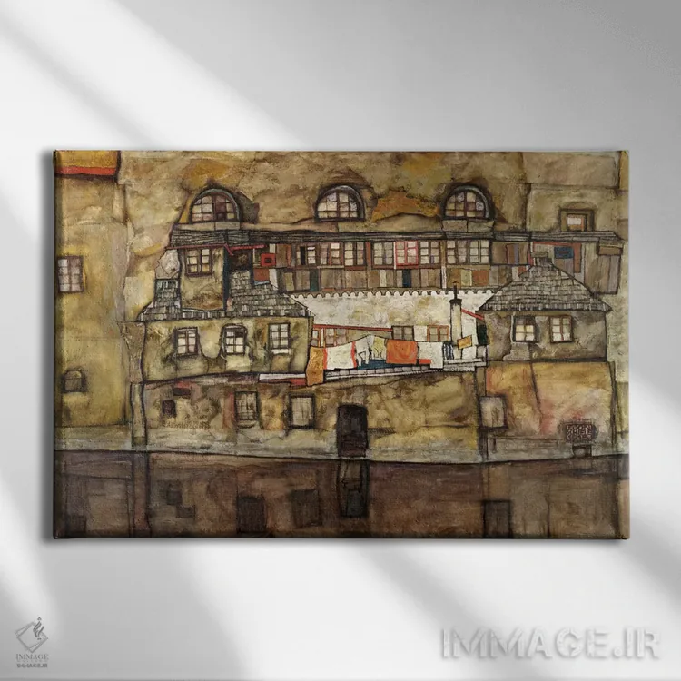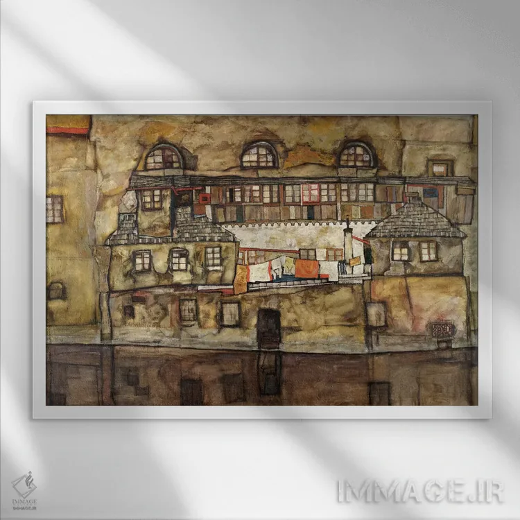 اگر به معماری و جزئیات سازه علاقه دارید، «دیوار خانه کنار رودخانه» اثرِ «اگون شیله (نقاش اتریشی)» حس معاصر و منظم به دکور بدهد، برای محیطهای مدرن گزینهٔ مناسبیست. با قاب مشکی مات، جلوهٔ تمیزتری پیدا میکند.