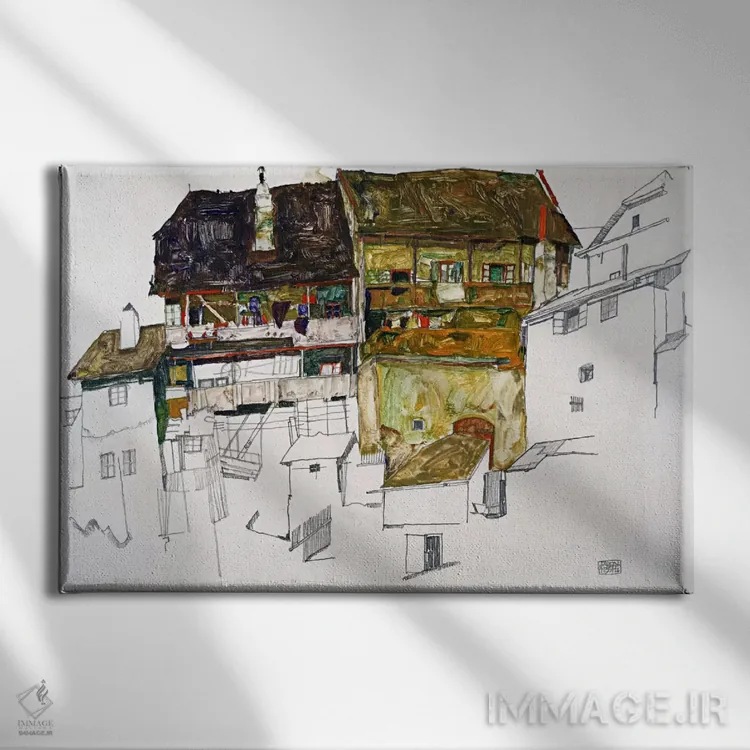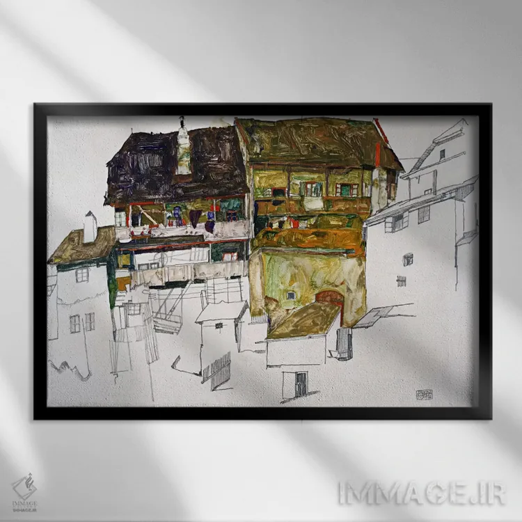 در «خانههای قدیمی در کروماو» اثرِ «اگون شیله (نقاش اتریشی)»، به دیوار، ریتم معماری اضافه کند؛ برای محیطهای مدرن انتخابی خوشسلیقه است. با قاب مشکی مات، جلوهٔ تمیزتری پیدا میکند.