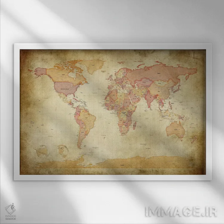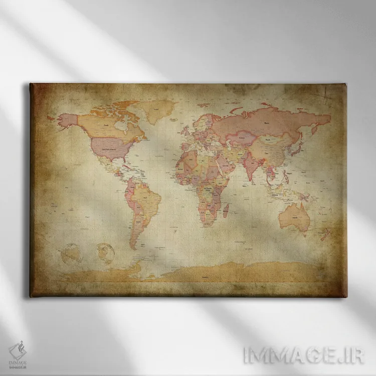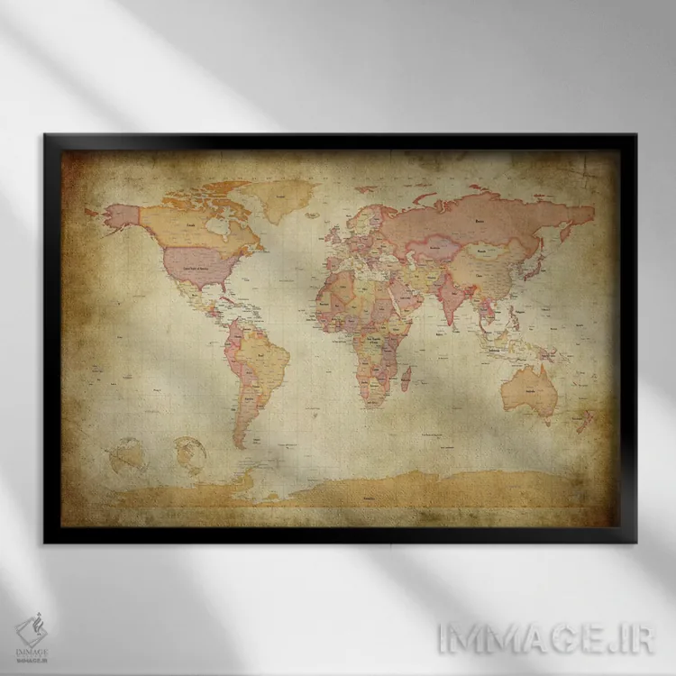 تابلو دکوراتیوِ «نقشهٔ جهان ۲»؛ مناسب برای فضاهایی با چوب تیره، چراغهای گرم و اکسسوریهای کلاسیک اثرِ «مایکل تامپست».