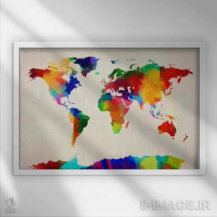 تابلو نقشهٔ جهان ۴ اثر مایکل تامپست - نمای قاب‌دار سفید