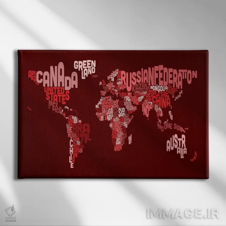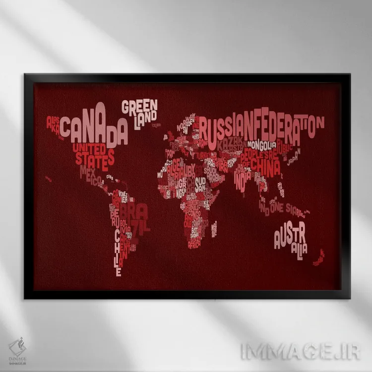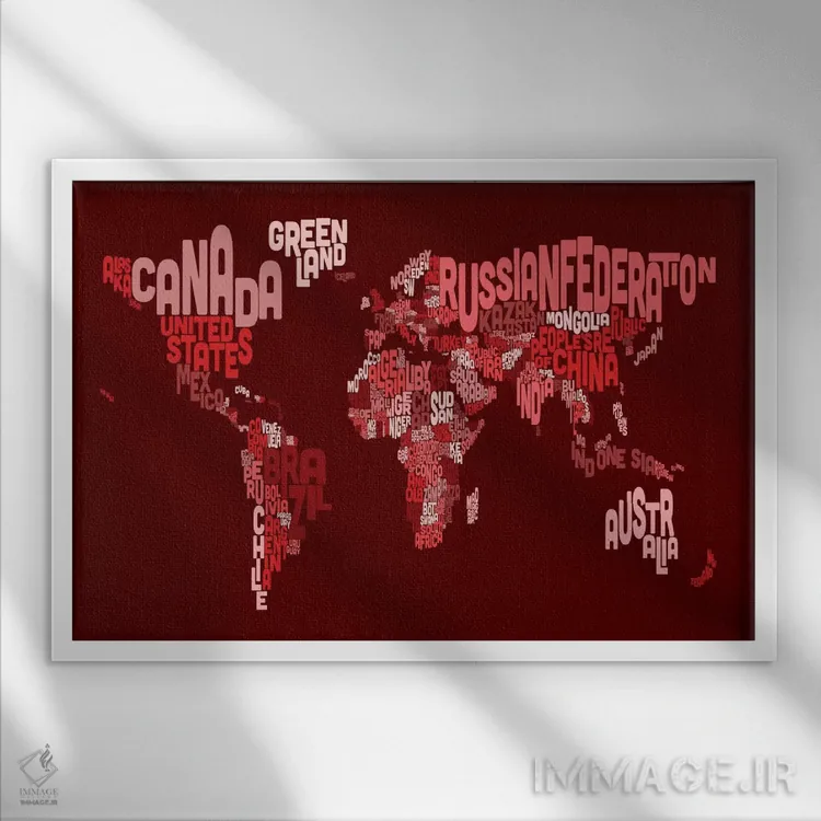 در «نقشهٔ تایپوگرافی جهان ۳ (قرمز)» اثرِ «مایکل تامپست»، ریتم بصری به چشم میآید؛ مناسب برای دیوار شاخص کنار مبلمان ساده.