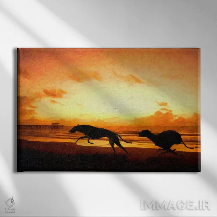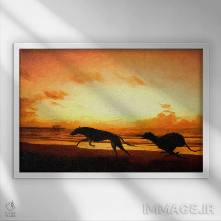 تابلو سگهای گریهاوند در ساحل هنگام غروب اثر مایکل تامپست