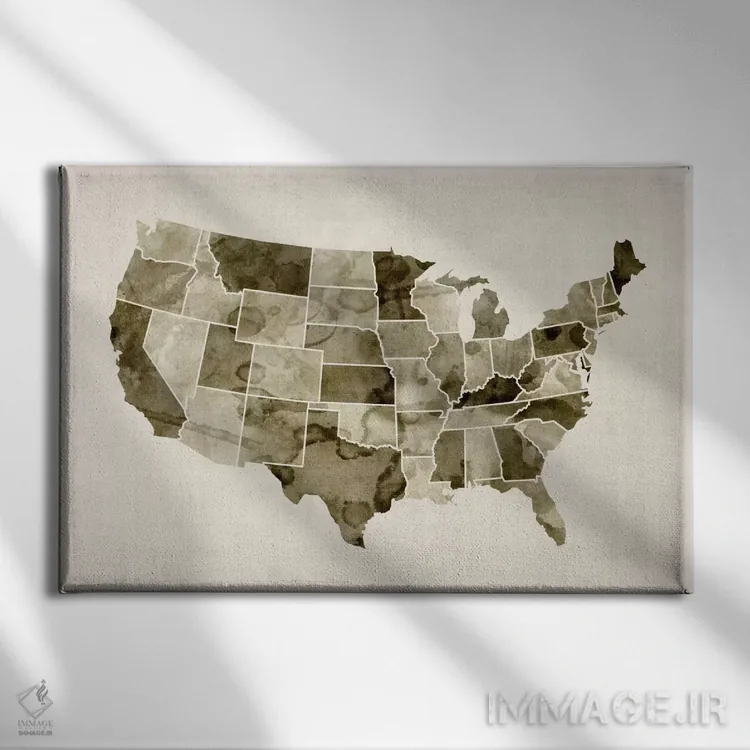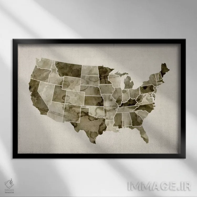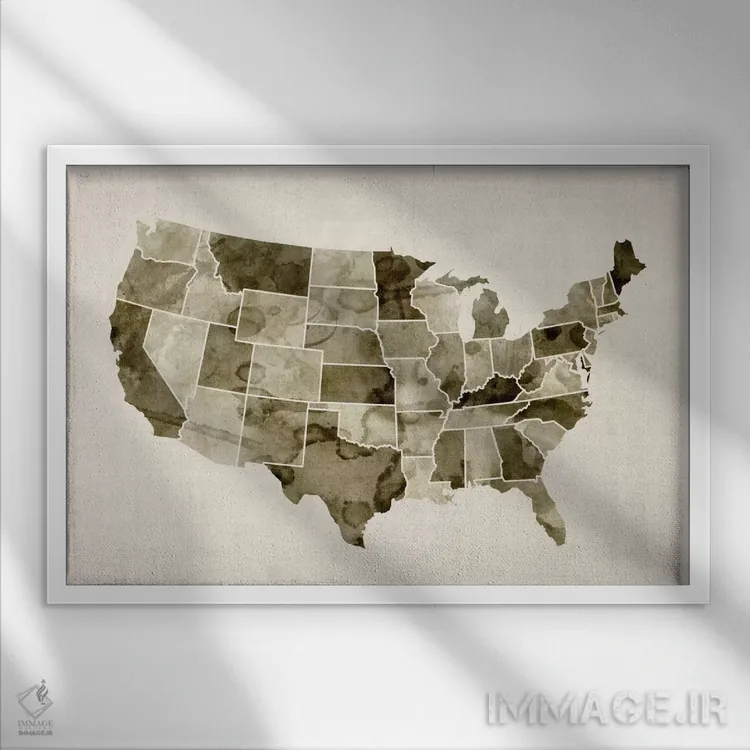 در «نقشهٔ ایالات متحده با آبرنگ ۲» اثرِ «مایکل تامپست»، ریتم بصری به چشم میآید؛ مناسب برای دیوار شاخص کنار مبلمان ساده.