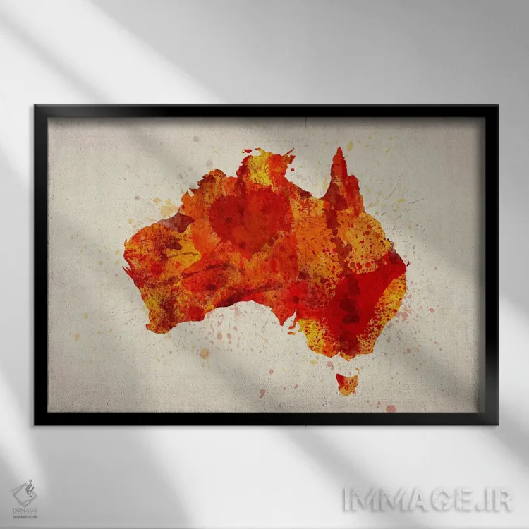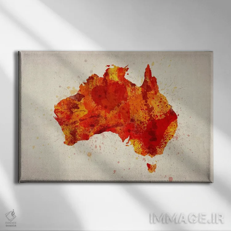 در «نقشهٔ استرالیا (قرمز؛ پاشش رنگ)» اثرِ «مایکل تامپست»، ریتم بصری به چشم میآید؛ مناسب برای دیوار شاخص کنار مبلمان ساده.
