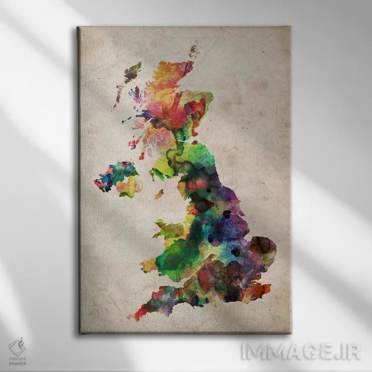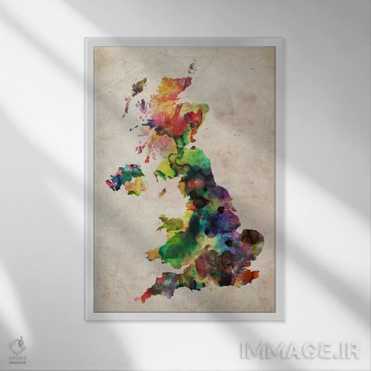 تابلو نقشهٔ پادشاهی متحد با آبرنگ اثر مایکل تامپست - نمای قاب‌دار سفید