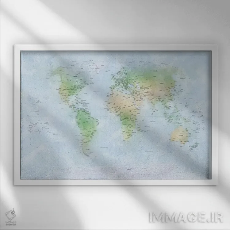 تابلو نقشهٔ جهان ۳ اثر مایکل تامپست - نمای قاب‌دار سفید