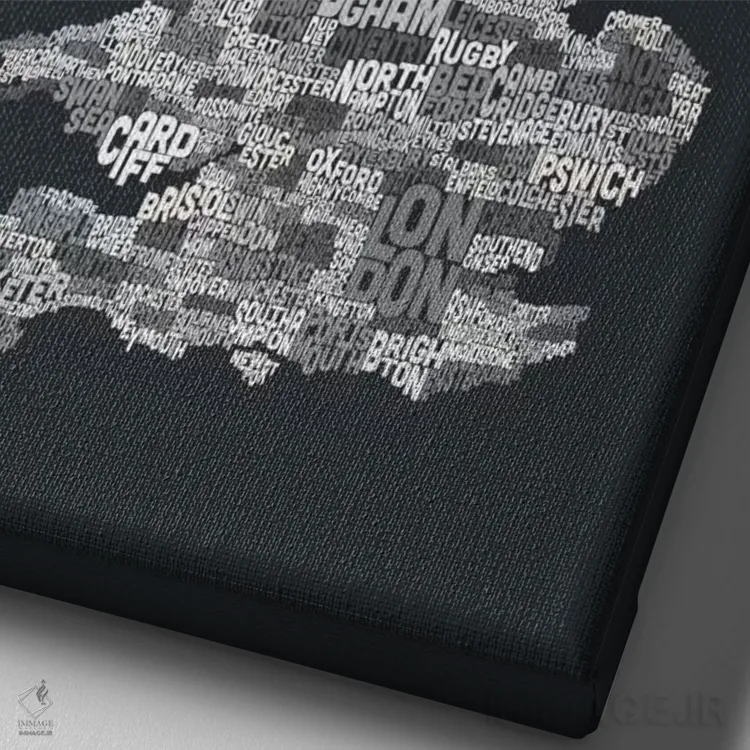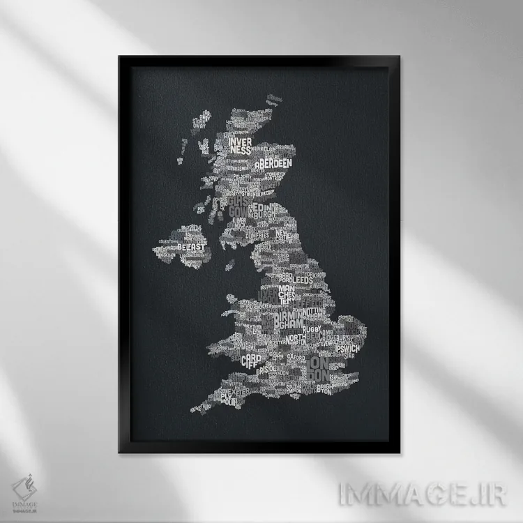 در «نقشهٔ متنی شهرهای بریتانیا (خاکستری)» اثرِ «مایکل تامپست»، ریتم بصری به چشم میآید؛ مناسب برای دیوار شاخص کنار مبلمان ساده.