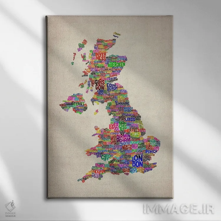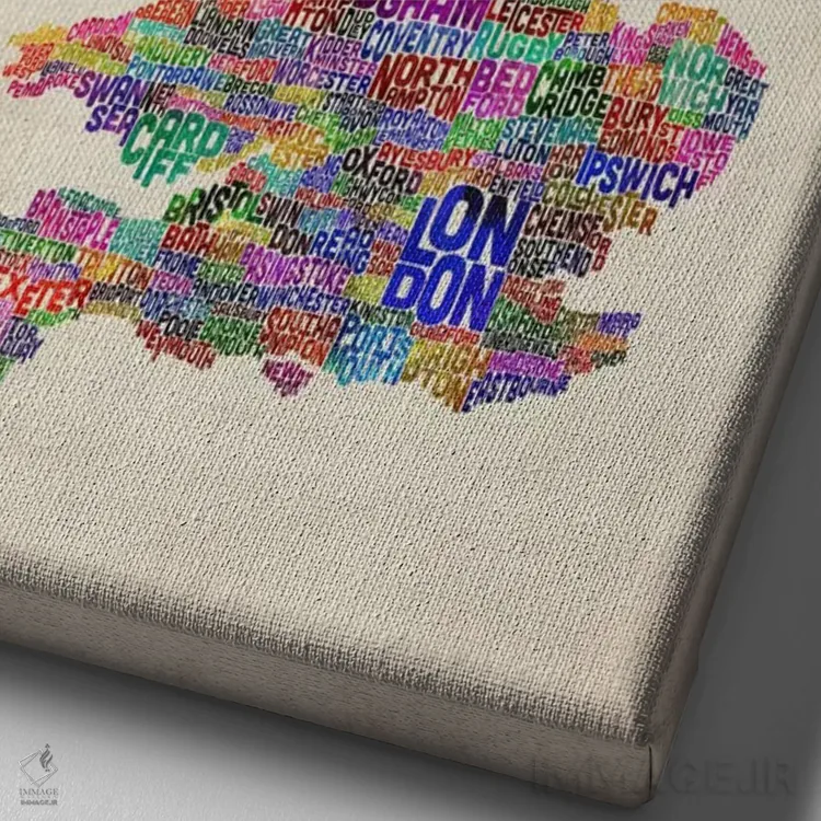 تابلو دکوراتیوِ «نقشهٔ متنی شهرهای بریتانیا و بریتانیای کبیر IV»؛ مناسب برای دکورهای مدرن که به یک نقطهی هنری نیاز دارند اثرِ «مایکل تامپست».