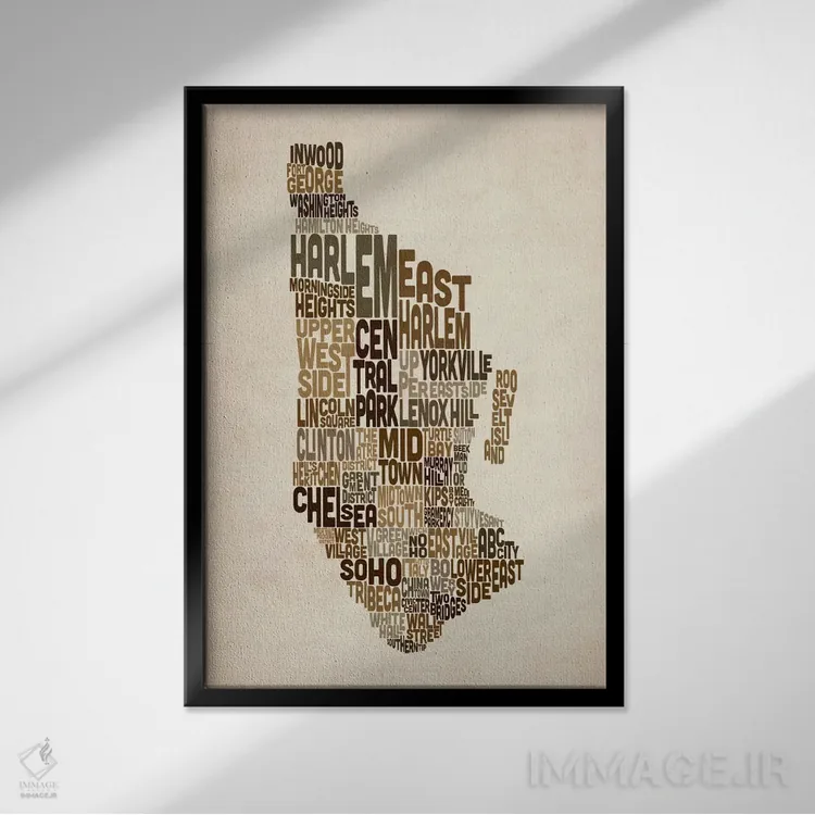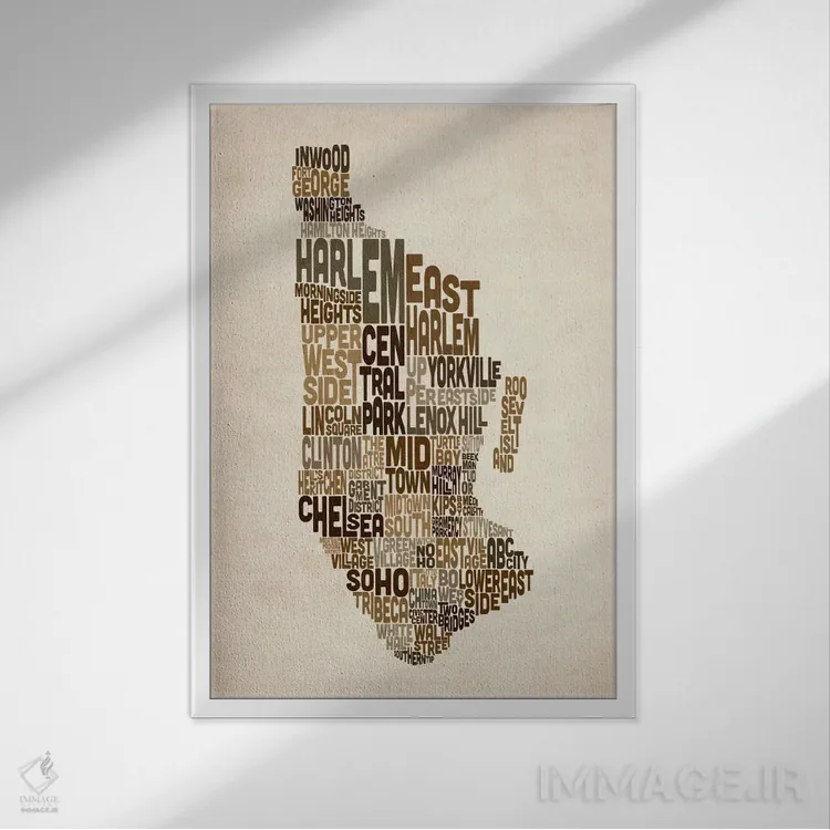 در «نقشهٔ تایپوگرافیک نیویورک III» اثرِ «مایکل تامپست»، ریتم بصری به چشم میآید؛ مناسب برای دیوار شاخص کنار مبلمان ساده.