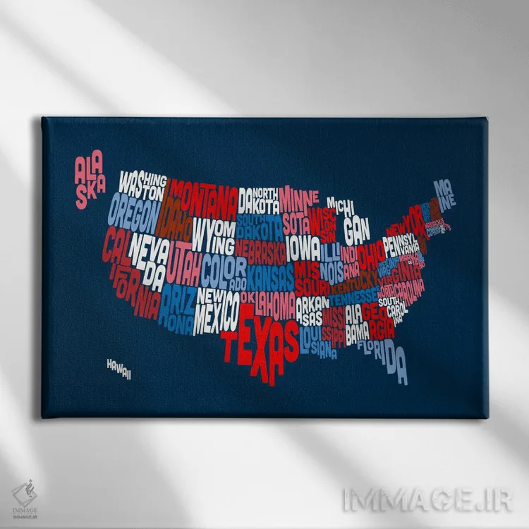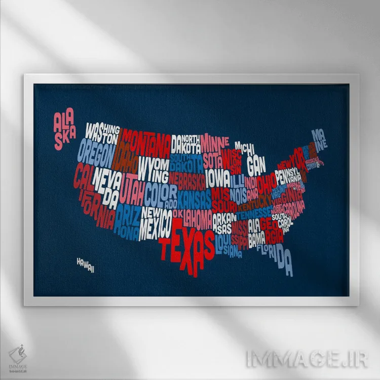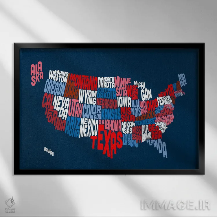 «نقشهٔ تایپوگرافیک ایالتهای آمریکا II» اثرِ «مایکل تامپست» با زبان هنری، کنار رنگهای خنثی و متریالهای مدرن (بتن، فلز، چوب) خیلی خوب مینشیند.