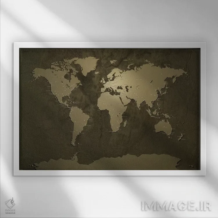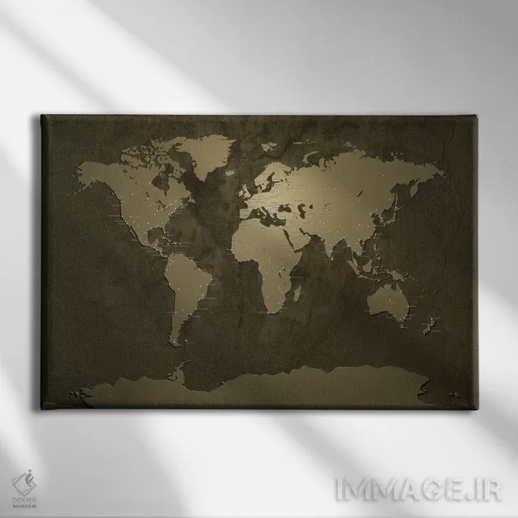 «نقشهٔ شهرهای جهان V» اثرِ «مایکل تامپست» با زبان هنری، کنار رنگهای خنثی و متریالهای مدرن (بتن، فلز، چوب) خیلی خوب مینشیند.