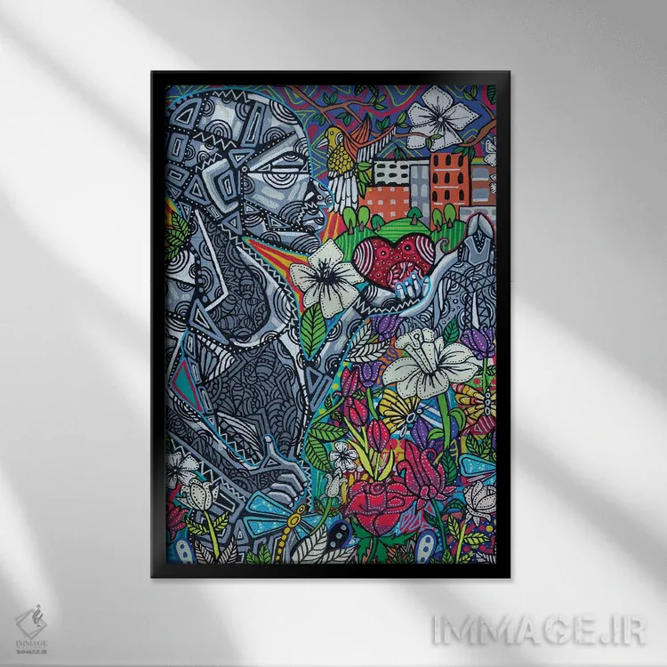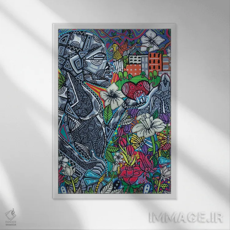 براساس پالت ترکیبی اثر، قاب تیک گرم (چوبی) پیشنهاد اول است و مشکی مات (فریم متوسط) مکمل. برای سفارشهای پروژهای با ابعاد و قابهای اختصاصی با ایماژ در تماس باشید.