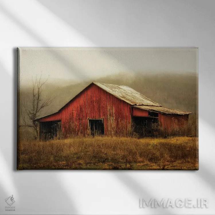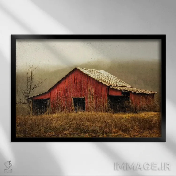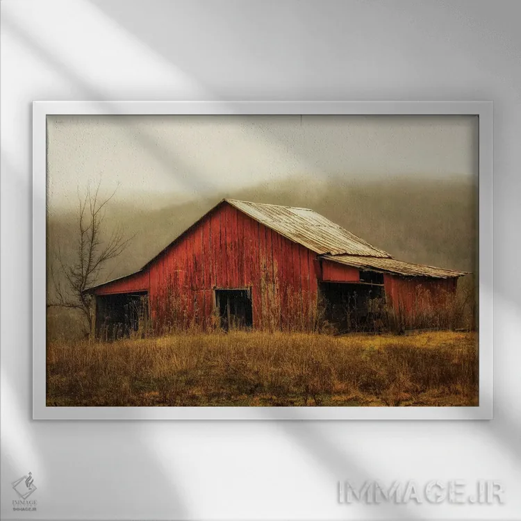 تابلو انباری با نورگیر در مه اثر اندی اموس - نمای قاب‌دار سفید