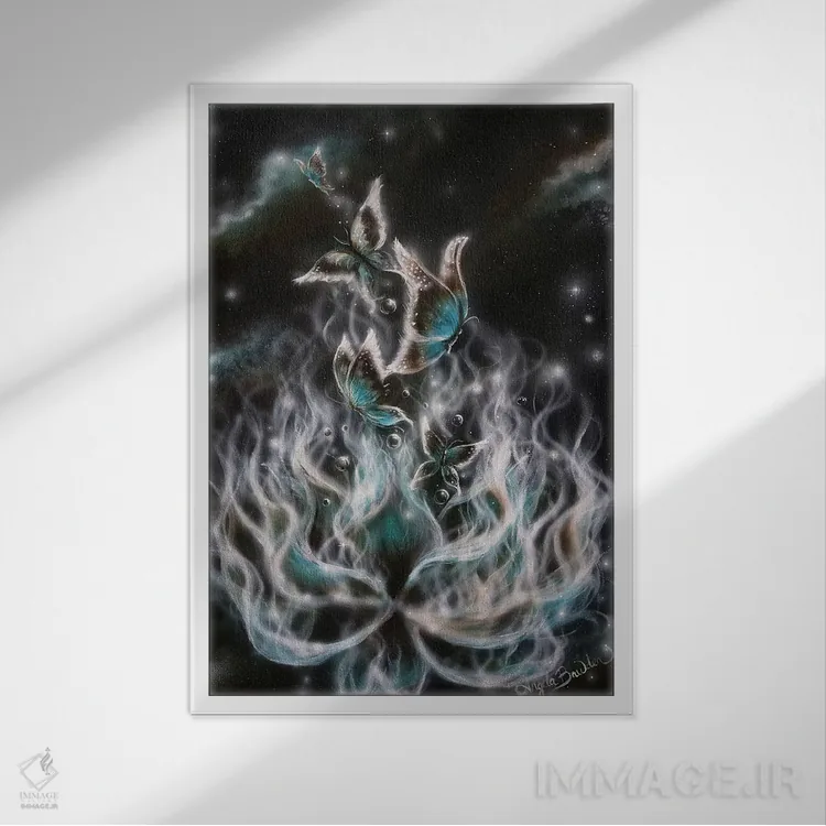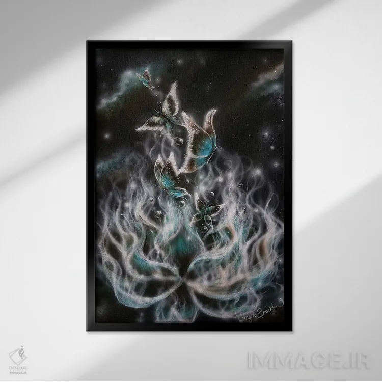 براساس پالت سرد اثر، قاب سفید مات (فریم باریک) پیشنهاد اول است و نقرهای برسخورده (متالیک) مکمل. برای سفارشهای پروژهای با ابعاد و قابهای اختصاصی با ایماژ در تماس باشید.