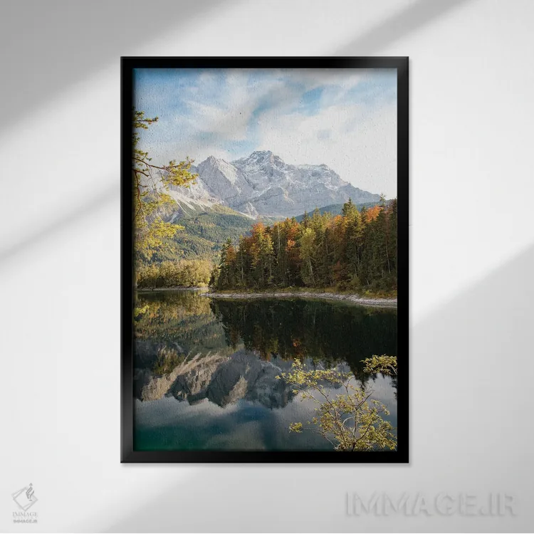 تابلو سعادت دریاچه کوهستانی یک اثر هنر آنیتا و بلا - نمای قاب‌دار مشکی