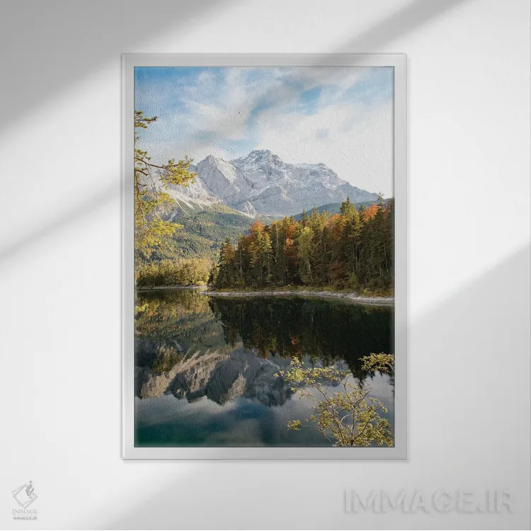 تابلو سعادت دریاچه کوهستانی یک اثر هنر آنیتا و بلا - نمای قاب‌دار سفید