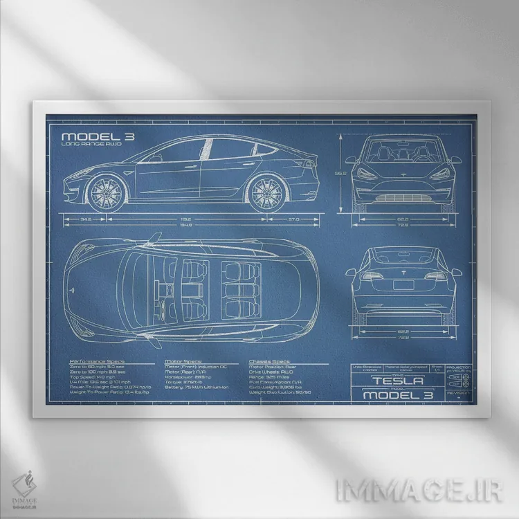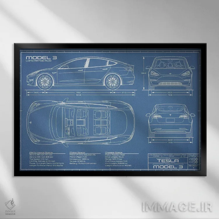 تابلو نقشهٔ تسلا مدل ۳ (Long Range RWD) اثر اکشن بلوپرینتس (نقشههای اکشن)