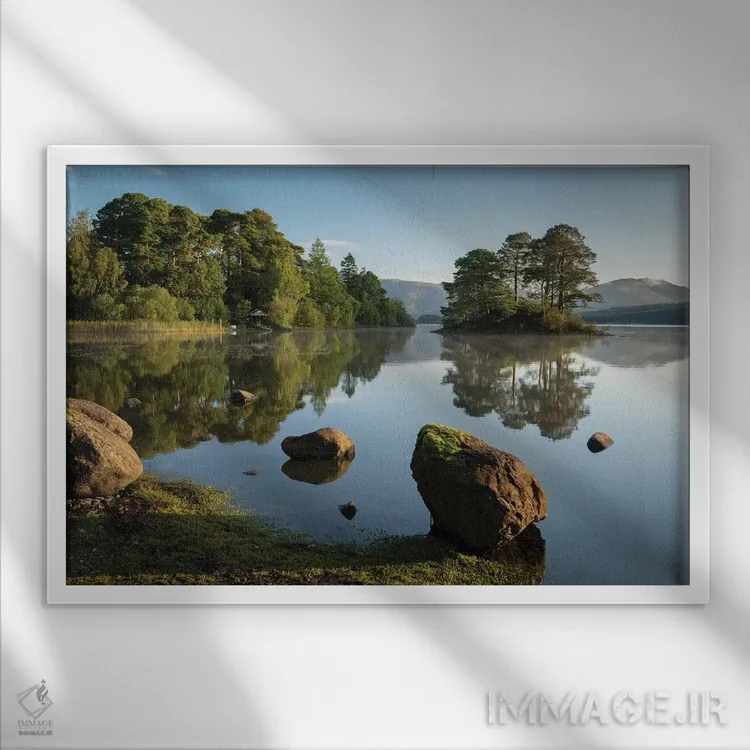 تابلو انعکاس‌های دروِنت واتر (نام دریاچه) اثر آدام برتون - نمای قاب‌دار سفید