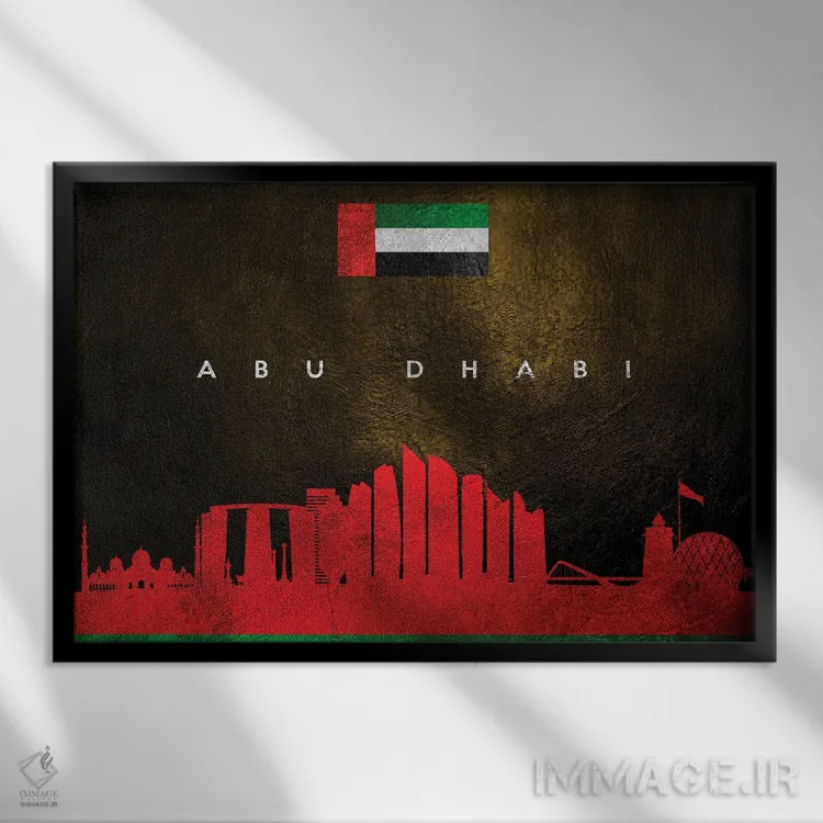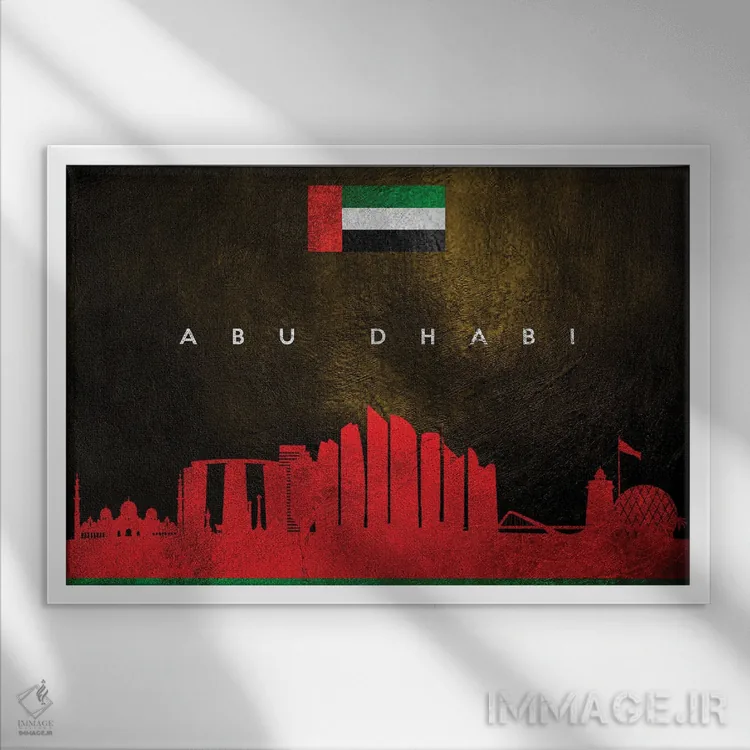 «منظرهٔ افقی ابوظبی (امارات متحده عربی)» اثرِ «آدریان بالدُوینو» یک اثر گرافیکیِ مرتب است که با قابهای ساده و چیدمانهای امروزی خوب مینشیند.