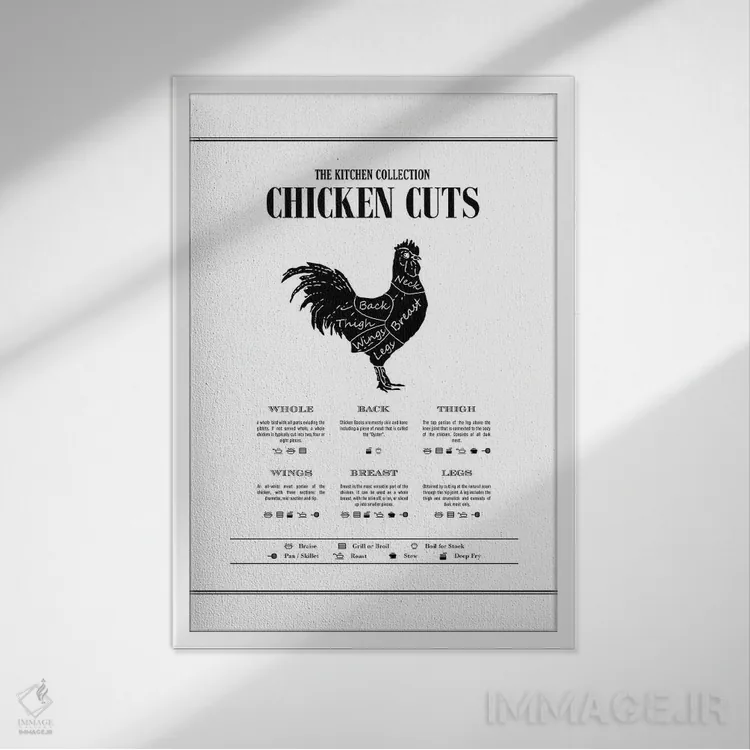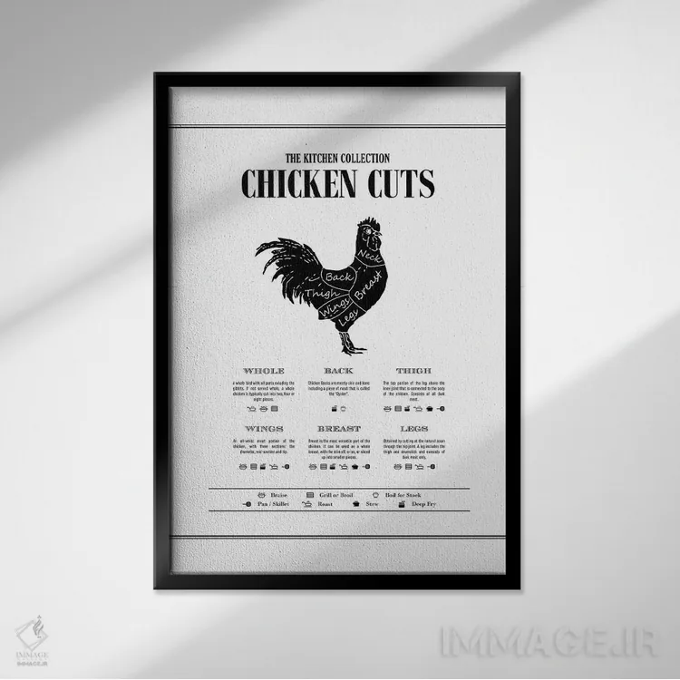 برای دیوارهای ساده، «برشهای مرغ (انواع قطعات مرغ)» اثرِ «پوسترهای طراحی آلچرا» برای دکورهای مینیمال، یک نقطهٔ توجه میسازد؛ برای فضاهای روستیک یا بوهو انتخابی خوشسلیقه است. در کنار گیاهان و نور طبیعی، جذابتر هم میشود.