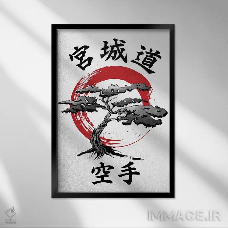 «میاگی دو (سبک نقاشی سومیه—هنر رزمی)» اثرِ «آنتونیو کامارنا» با حالوهوای آسیایی، کنار نور ملایم و متریالهای طبیعی (چوب/سنگ) بسیار خوشفرم دیده میشود.