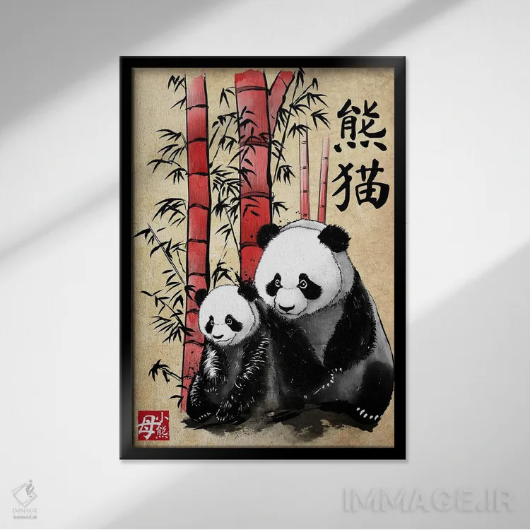 تابلو پاندا و توله (نقاشی سومیه) اثر آنتونیو کامارنا - نمای قاب‌دار مشکی
