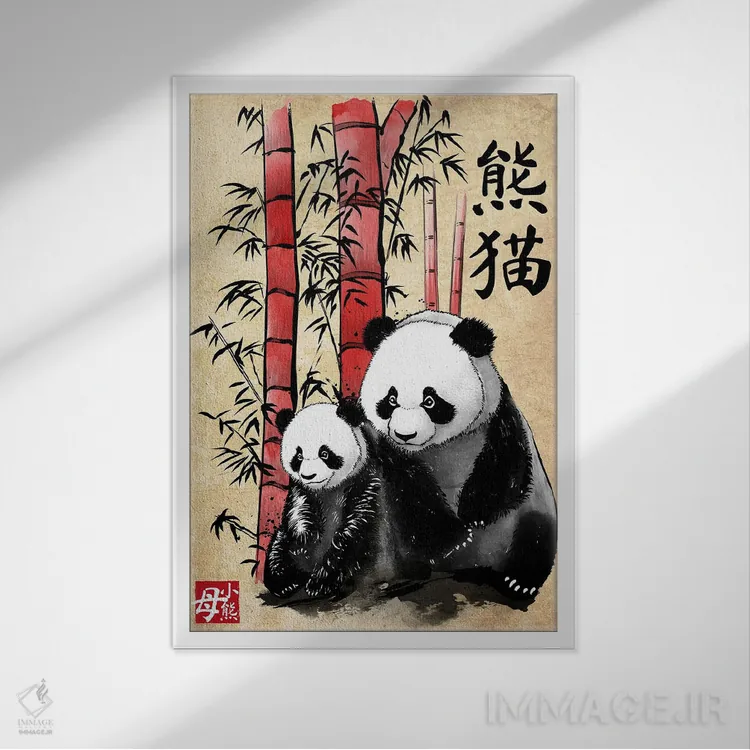 تابلو پاندا و توله (نقاشی سومیه) اثر آنتونیو کامارنا - نمای قاب‌دار سفید