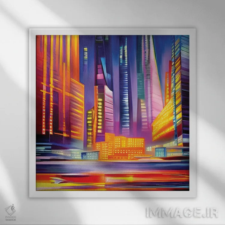تابلو شهر سایبرپانک رنگارنگ اثر آلساندرو دلا توره - نمای قاب‌دار سفید
