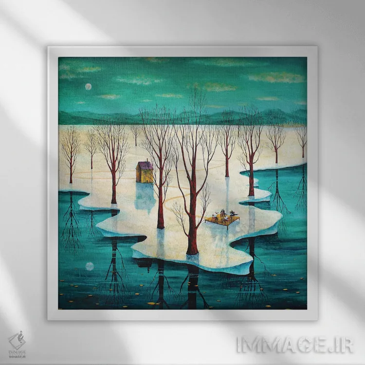 براساس پالت ترکیبی اثر، قاب بلوط روشن (چوبی) پیشنهاد اول است و استخوانی ملایم مکمل. برای سفارشهای پروژهای با ابعاد و قابهای اختصاصی با ایماژ در تماس باشید.