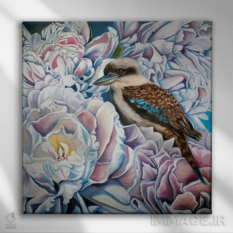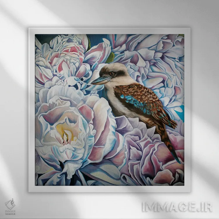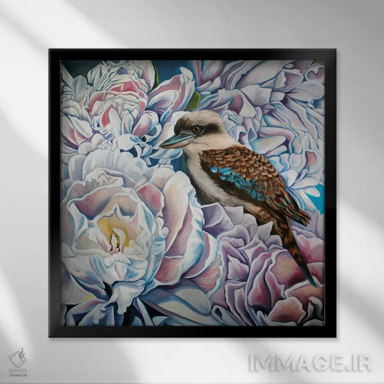 تابلو پیونیها و کوکابورا (پرنده) اثر آماندا کامرون