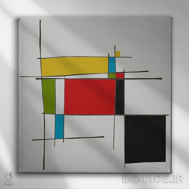 «یاد موندریان II» اثرِ «آنجِل استوز» یک انتخاب مدرن است؛ سبک هنری کمک میکند چیدمان مرتب بماند و دیوار حرفهای دیده شود.