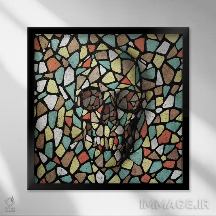 تابلو جمجمه موزاییک رنگی اثر علی گولچ - نمای قاب‌دار مشکی