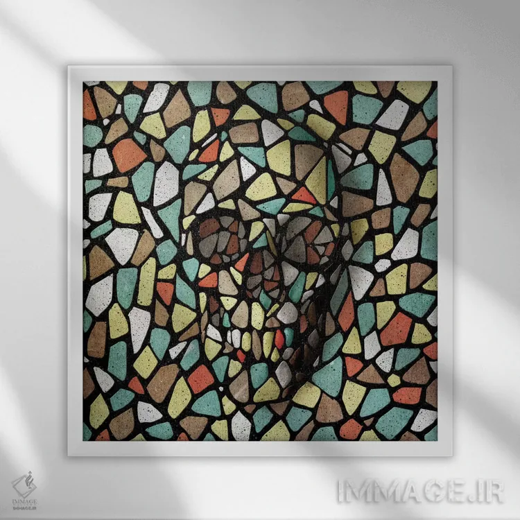 تابلو جمجمه موزاییک رنگی اثر علی گولچ - نمای قاب‌دار سفید